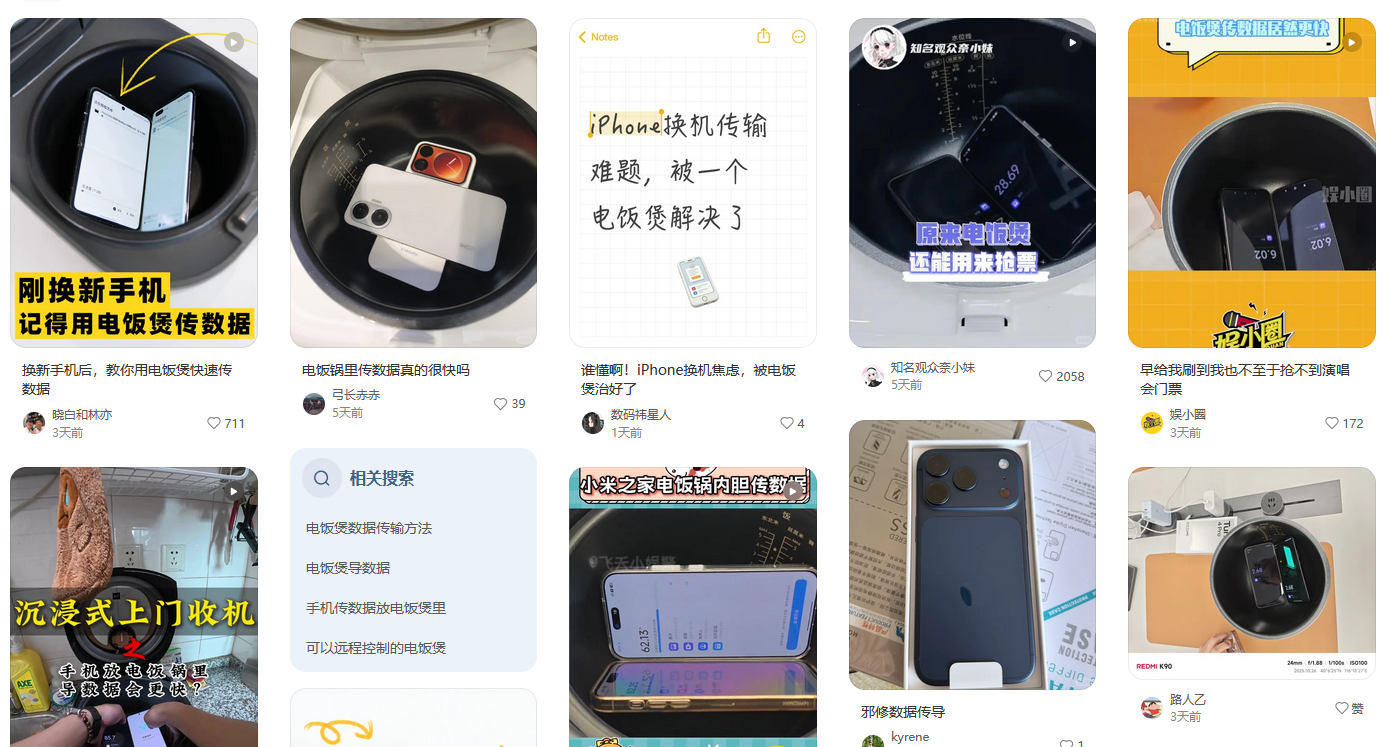 於是,有不少網友在社媒上分享了一個看起來有些莫名其妙的“偏方”:把新舊手機同時放進電飯煲的內膽裏,傳數據會更快。這一説法讓不少網友“大跌眼鏡”,儘管有不少人表示懷疑,但也有人經過“實測”後表示“確實有效”。