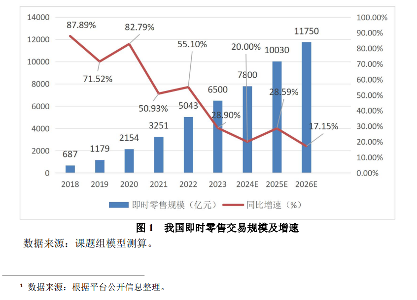 近年來,即時零售市場不斷擴容,保持着亮眼的發展勢頭。商務部國際貿易經濟合作研究院發佈的《即時零售行業發展報告(2024)》顯示,2023年我國即時零售市場規模達6500億元,同比增長28.89%;預計2030年我國即時零售市場規模將超2億元,訂單量持續增長。