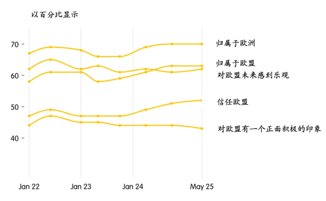 歐盟信任度二十年:2005—2025年成員國平均值(百分比) 數據來源:歐洲晴雨表
