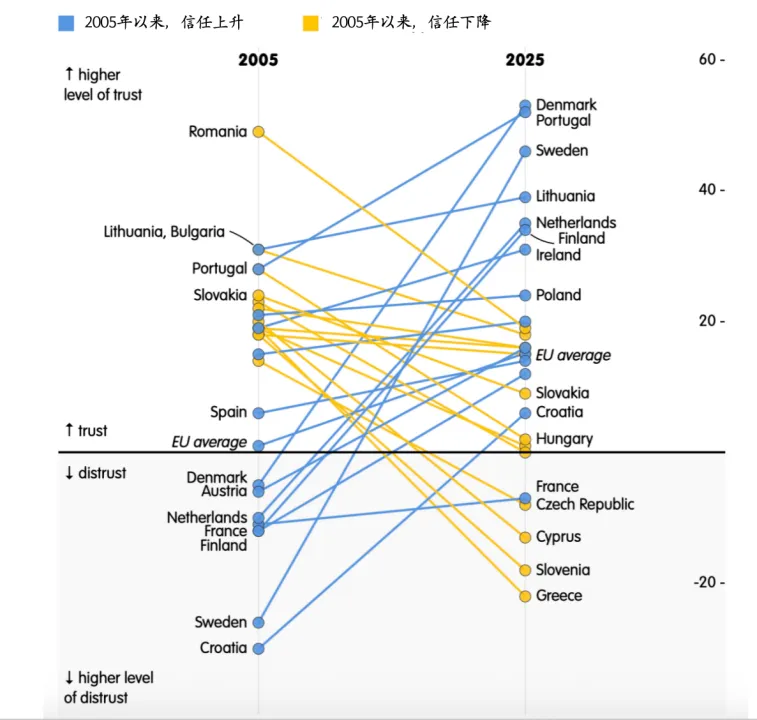 按成員國劃分的歐盟信任度二十年:2005年與2025年對比(信任與不信任歐盟人羣的淨差值,百分比) 數據來源:歐洲晴雨表