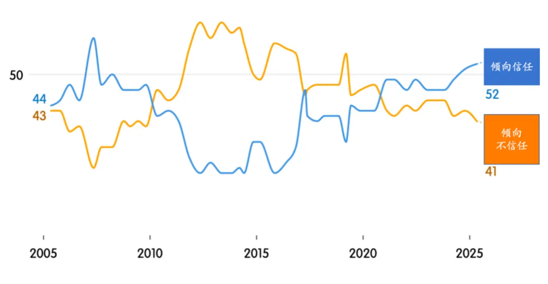 歐洲晴雨表(Eurobarometer)數據顯示,歐洲民眾對歐盟的信任度已達到2007年以來的最高水平。2024年秋季至2025年春季期間,有12個國家的民眾對歐盟信任度甚至進一步上升,其中瑞典、法國、丹麥和葡萄牙的增幅最為顯著。