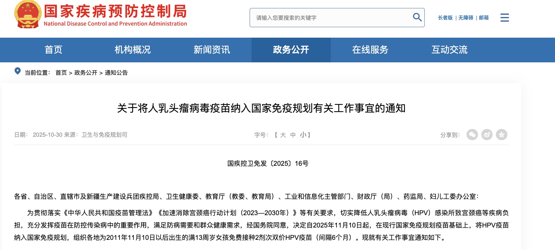 10月30日,國家疾控局、國家衞生健康委等七部門聯合發佈重磅消息,自2025年11月10日起,人乳頭瘤病毒(HPV)疫苗將正式納入國家免疫規劃。