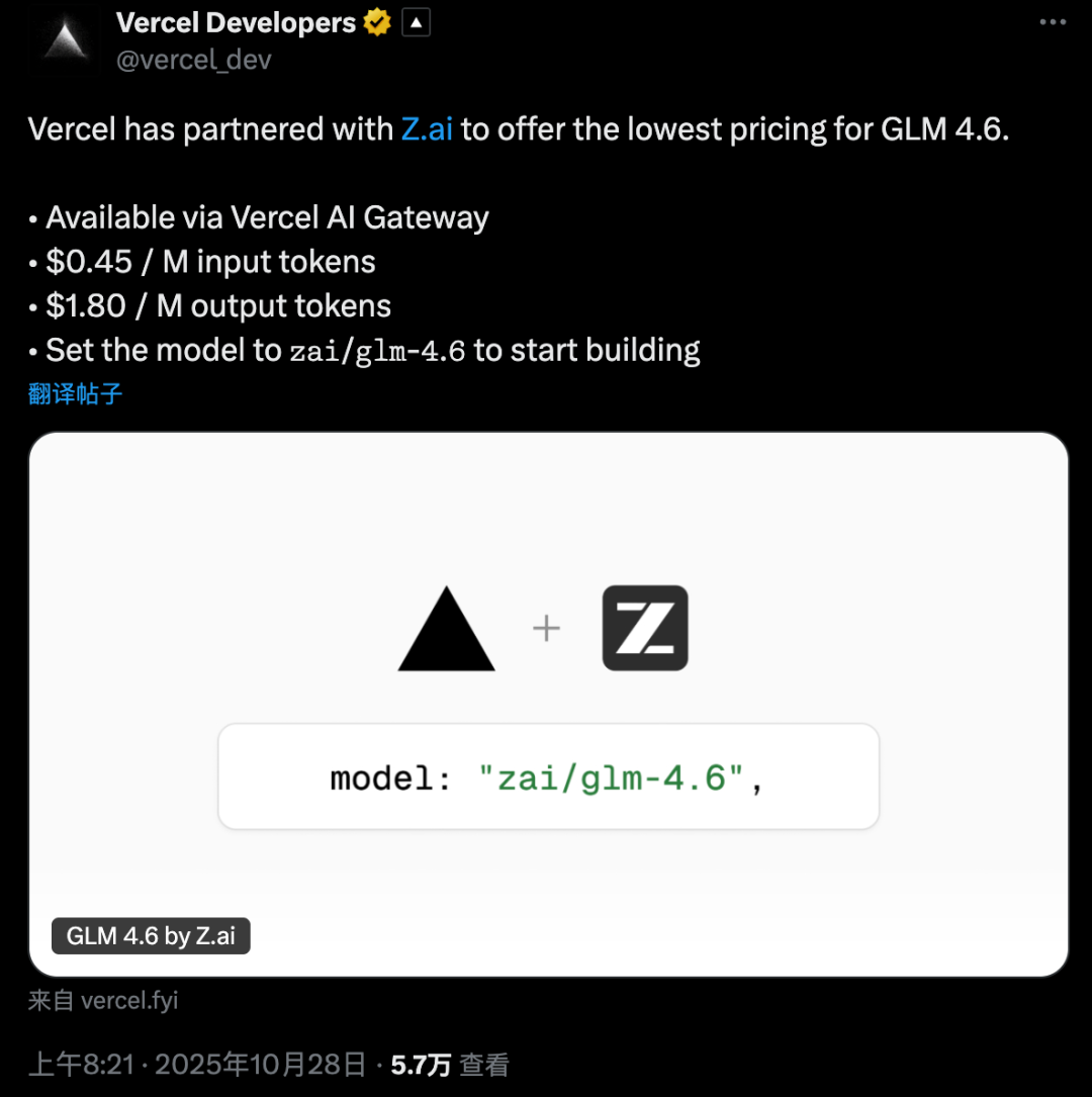 更重磅的是,估值高達93億美元的美國公司Vercel近日公開宣佈,已和智譜達成合作,在其平台上提供GLM-4.6的API服務。其老闆Guillermo Rauch更是轉發稱讚GLM 4.6“很好,在http://nextjs.org/evals上排名第三,還是前五名裏唯一開源的模型”。