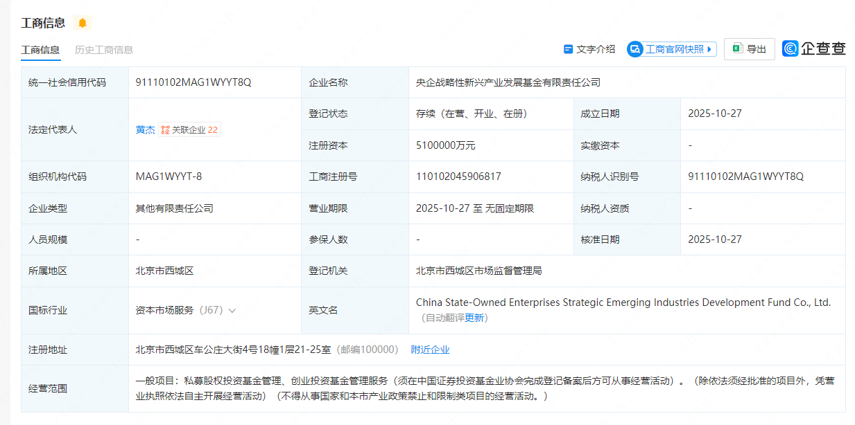 另據工商信息,該基金的其他出資方還包括北京金融街資本運營集團有限公司、中移資本控股有限責任公司、中國石化集團資本有限公司、中國石油集團崑崙資本有限公司、中國電信集團投資有限公司等。