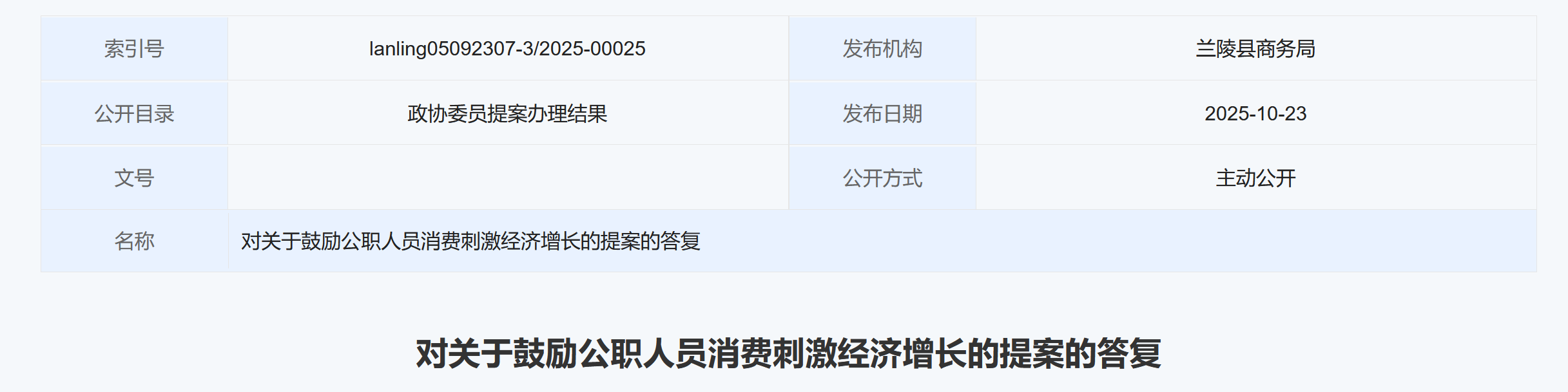 據山東臨沂蘭陵縣人民政府網站消息,近日,蘭陵縣商務局就政協委員提出的“鼓勵公職人員消費刺激經濟增長”提案作出答覆。答覆內容如下: