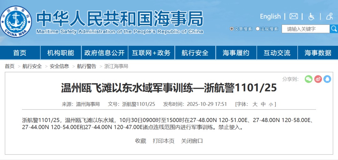 據中國海事局網站消息,10月29日,温州海事局發佈航行警告: