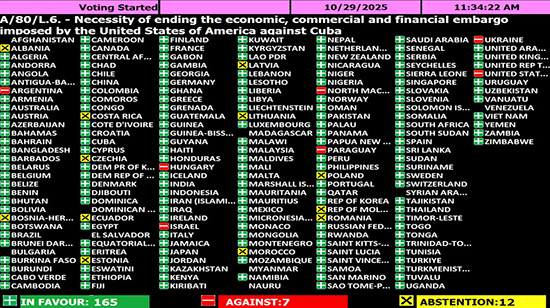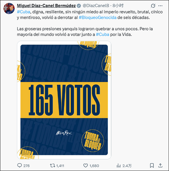 決議通過當天,古巴國家主席迪亞斯・卡內爾在X平台上發文,慶祝聯合國大會再次以壓倒性多數通過決議。