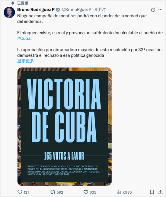 此外,古巴外長羅德里格斯當天也在X平台上表示,“沒有任何謊言宣傳能夠戰勝古巴所捍衞真理的力量。雖然封鎖確實存在,也給古巴人民帶來了無法估量的痛苦,但聯大第33次以壓倒性多數通過這項決議,再次表明國際社會堅決反對這種‘毫無道義依據、帶有種族滅絕性質’的政策。”