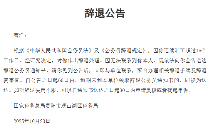 10月23日,《貴州日報》刊發了一則國家税務總局貴陽市觀山湖區税務局的《辭退公告》,被辭退人為公務員曹洋。