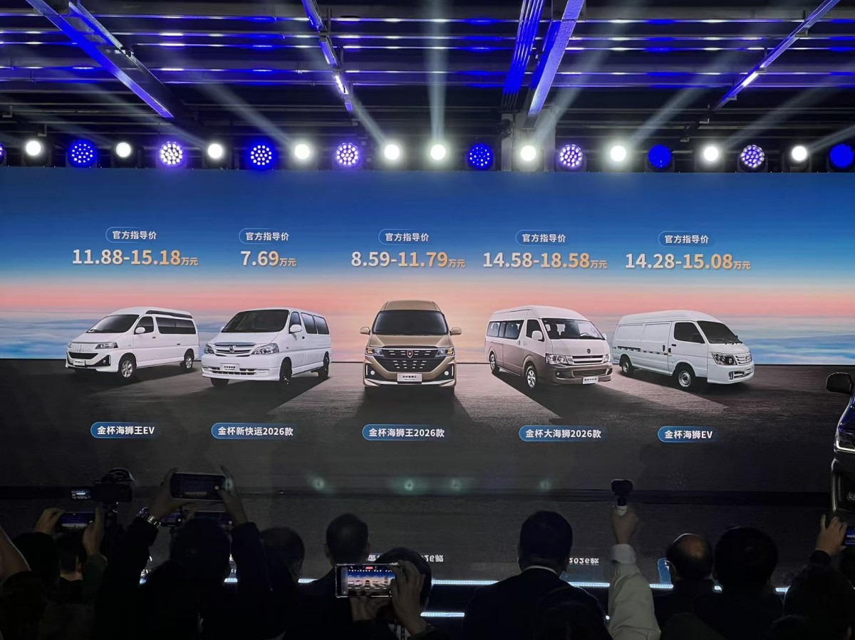 在產品端,金盃在當天集中上市了5款車型。分別為金盃海獅王2026款、金盃新快運2026款、金盃大海獅2026款三款燃油車型,以及金盃海獅EV、金盃海獅王EV兩款純電車型。五款車型覆蓋物流配送、商務通勤與團體客運等高頻場景,價格區間為7.69萬—18.58萬元,並配套“金”彩啓程車享無憂計劃,為運營用户提供最高1.5萬元的綜合權益以降低運營成本。