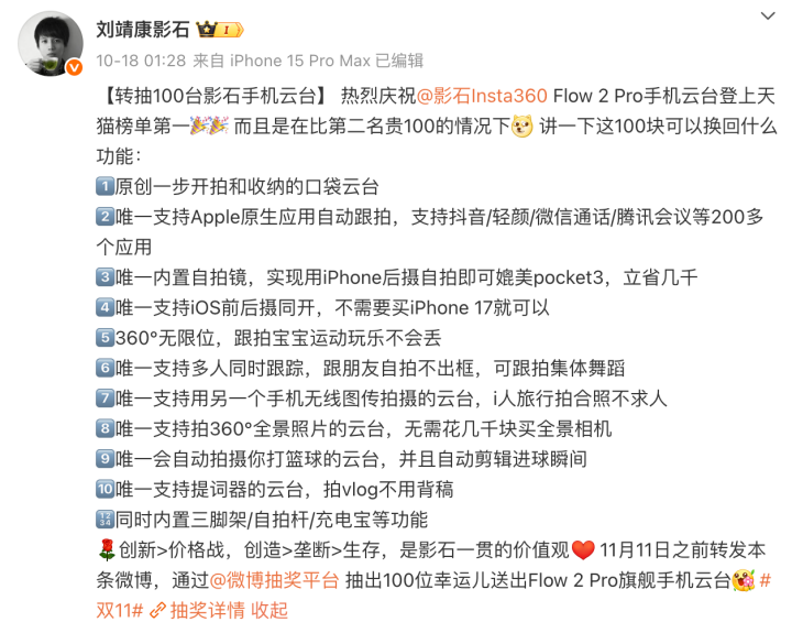 影石創始人劉靖康在微博上提到,公司產品在市場競爭中的表現,強調創新的重要性,並指出影石在技術發展和市場擴展方面的持續努力。