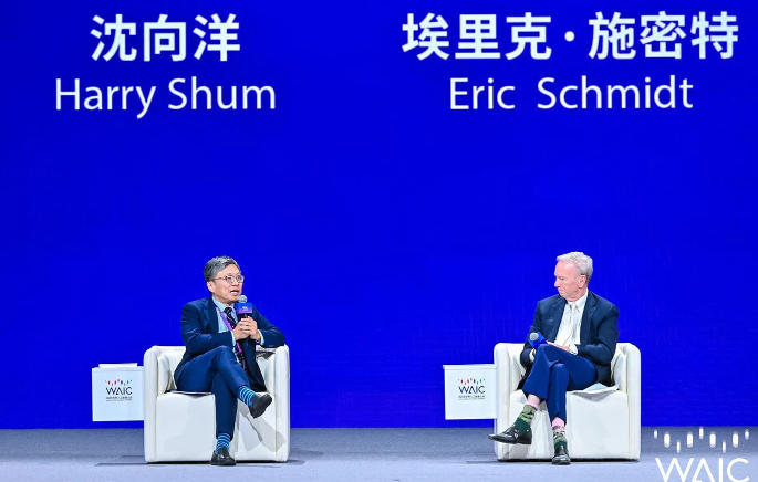 今年7月,施密特(右)在上海蔘加2025世界人工智能大會(WAIC)