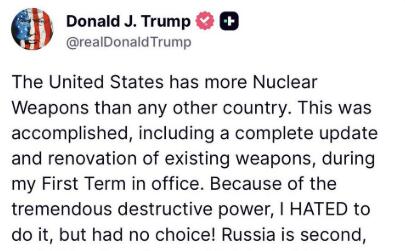 本週三,正在韓國釜山的美國總統唐納德·特朗普在其社交媒體賬號上表示,他“已經指示戰爭部在對等的基礎上開始核武器試驗,這一進程將‘立即啓動’,以應對其他國家的核試驗計劃”。特朗普稱,其他國家“似乎都在進行核試驗”,但擁有的核武器“比任何國家都要多”的美國卻不做核試驗,在看到其他國家做核試驗的情況下,美國也應該進行核武器試驗。當被問及將在哪裏進行核試驗時,特朗普表示“會公佈的,美國是有試驗場的”。