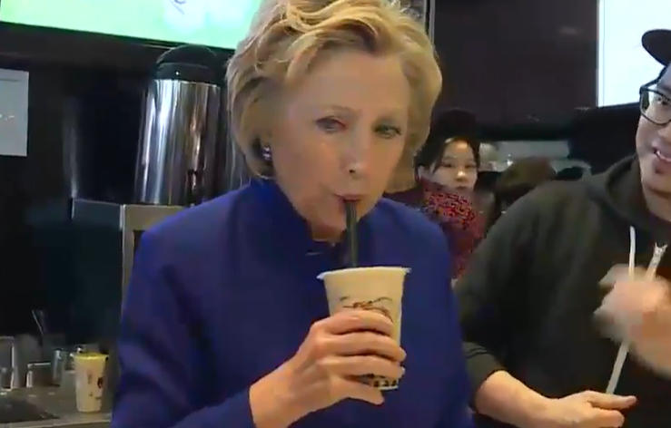 2016年4月,時任美國民主黨總統候選人希拉里現身紐約奶茶店 視頻截圖