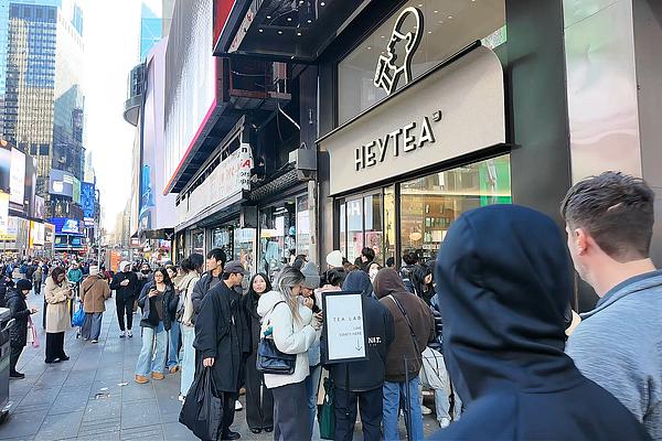 2025年3月,紐約時代廣場一家“喜茶”奶茶店前顧客大排長龍 視覺中國