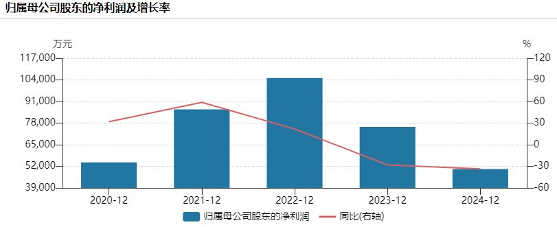 2024年,貝泰妮交出了上市以來最差的一份年度成績單,營收僅微增3.87%至57.36億元,而歸母淨利潤大幅下降33.5%至5.03億元,連續兩年出現下滑。