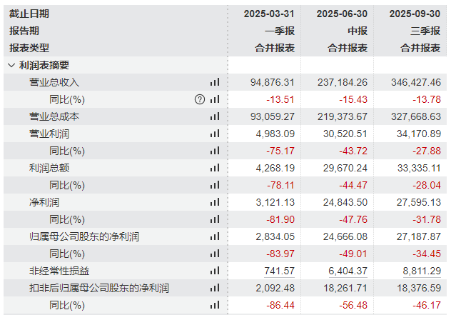 第一季度,公司營收9.49億元,同比下降13.51%,歸母淨利潤2834.05萬元,同比下滑83.97%;上半年營收23.72億元,同比下降15.43%,歸母淨利潤2.47億元,同比下滑49.01%。