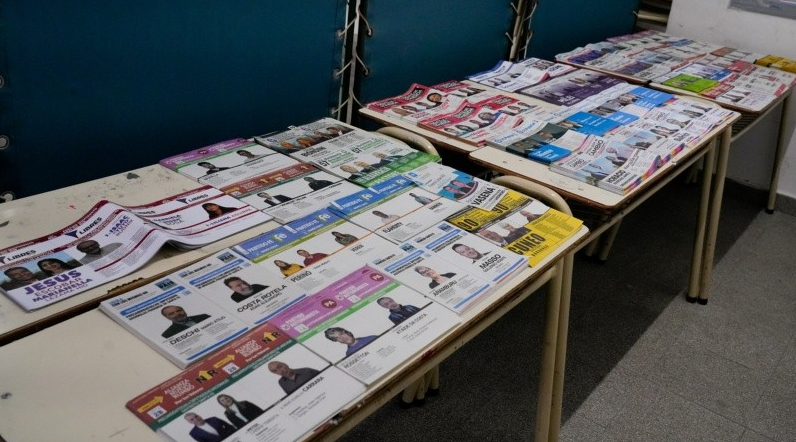 2023年阿根廷全國初選(PASO)時放在聖塔菲省一個投票站裏的各種政黨選票
