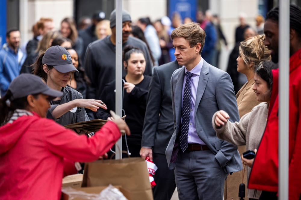 在紐約布朗克斯區,一家食品分發站外等候的人數比平時多了大約200人,許多人帶着可摺疊的購物車,排起了跨越數個街區的長隊。他們從成堆的水果、蔬菜、麪包、牛奶、果汁、乾糧和現成三明治中挑選食物,有些人凌晨4點就來了。