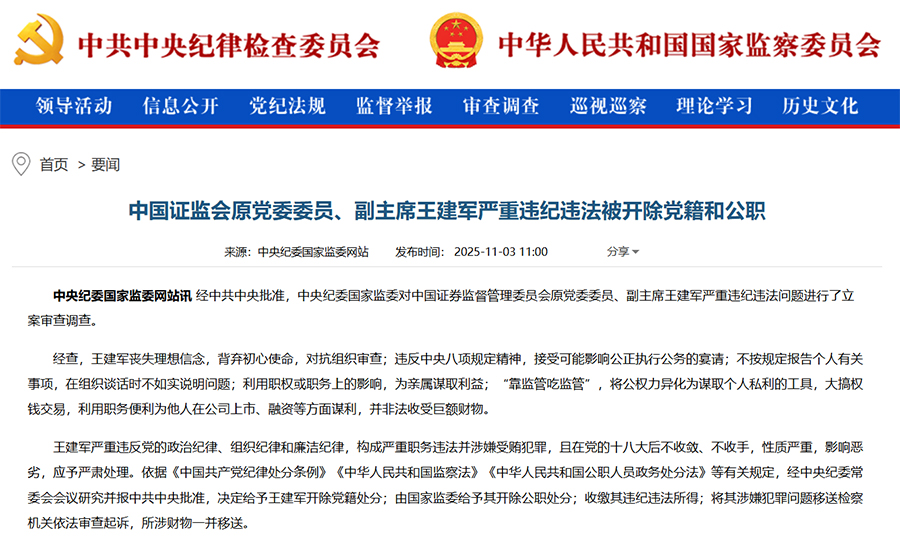 據中央紀委國家監委網站11月3日消息,經中共中央批准,中央紀委國家監委對中國證券監督管理委員會原黨委委員、副主席王建軍嚴重違紀違法問題進行了立案審查調查。