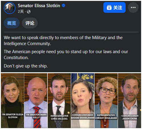 據美國全國公共廣播電台(NPR)11月20日報道,當地時間19日,六名民主黨眾議員在社交媒體“臉書”平台向美國軍方和情報界人士發表講話,稱“你們可以拒絕非法命令”,並多次重複這句話,最後強調“你們必須拒絕非法命令”。