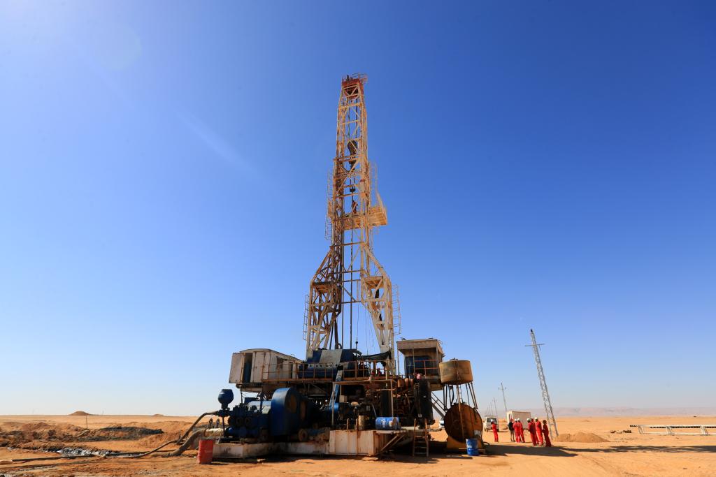 在埃及阿斯旺省城北部的考姆翁布沙漠腹地,鑽機轟鳴,工人在有序忙碌着,不遠處綠油油的小麥格外醒目。