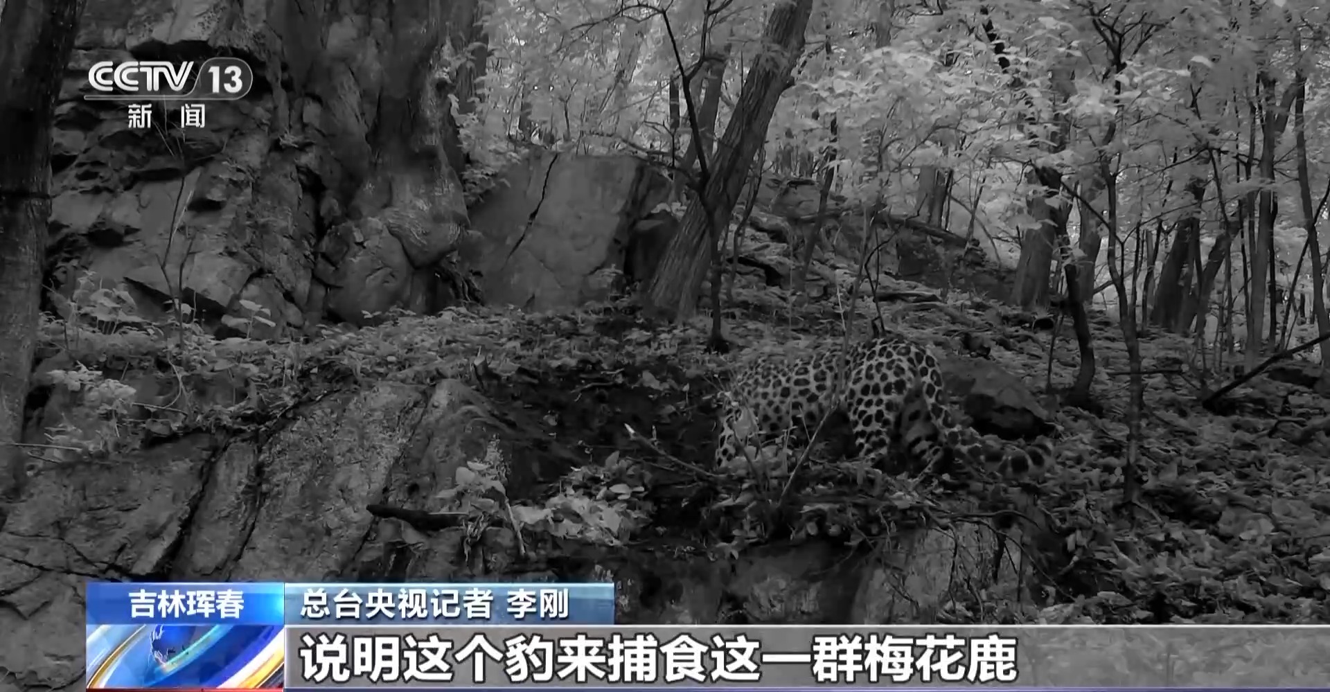 *總枱央視記者 李剛:*在這個位置,我們這台紅外相機拍到一羣鹿,聽到豹的叫聲後四散而去。不久豹就出現在這裏,説明這個豹在捕食這羣梅花鹿。