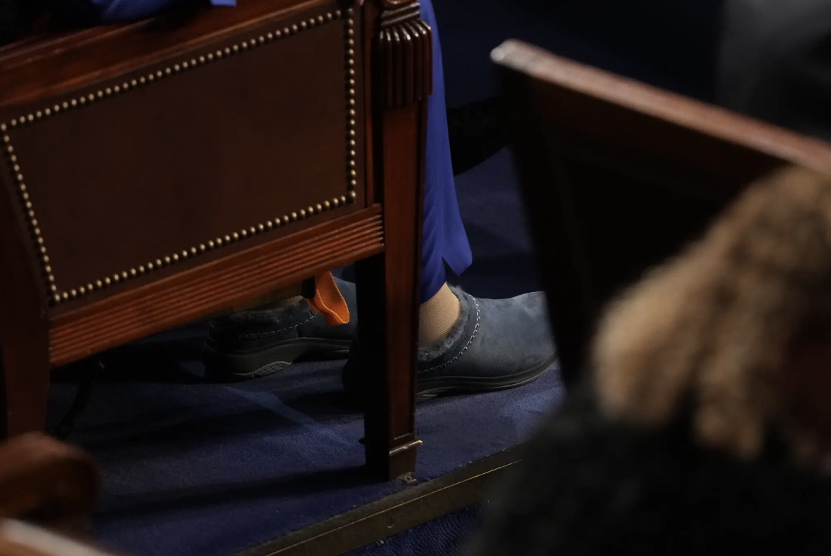 報道提到,佩洛西此次放棄了她一直以來穿着的高跟鞋,而是選擇了更為舒適的平底鞋。不過佩洛西的女兒在一條信息中透露,佩洛西的醫生還表示,佩洛西用前腳掌站立更好,沒必要永遠放棄高跟鞋。