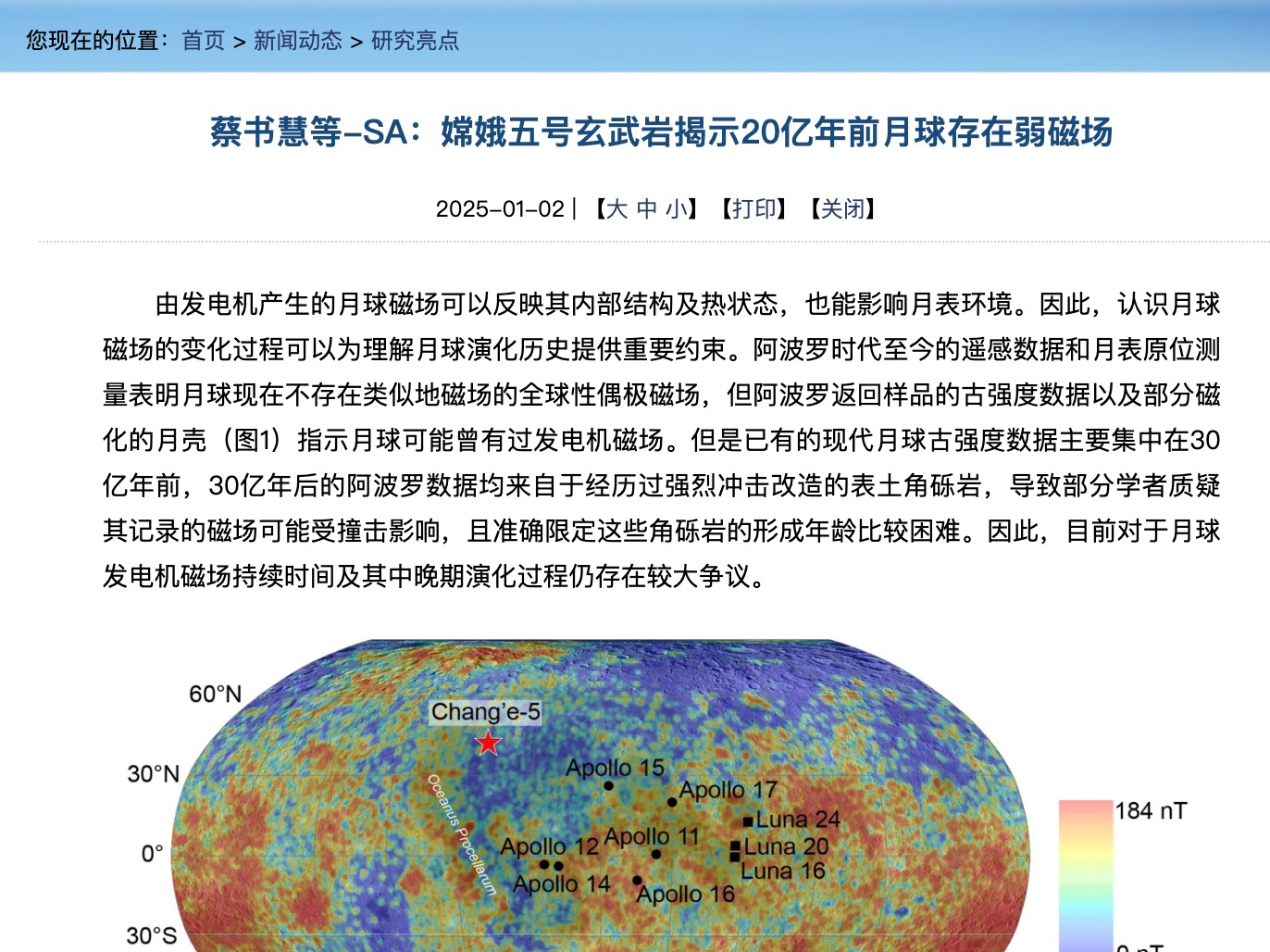 研究成果以封面文章發表於國際學術期刊Science Advances,封面文字介紹:“月球磁場的演化有助於解譯月球的內部結構、熱歷史和表面環境。蔡等人利用嫦娥五號任務從月球中緯度的風暴洋採集的月海玄武岩樣品,揭示了20億年前月球存在一個微弱的發電機磁場。他們的研究還提出了年輕月球火山活動起源的另一種可能機制。這些研究成果將有助於推動月球太空風化和揮發性物質的相關研究”。(勃潺)