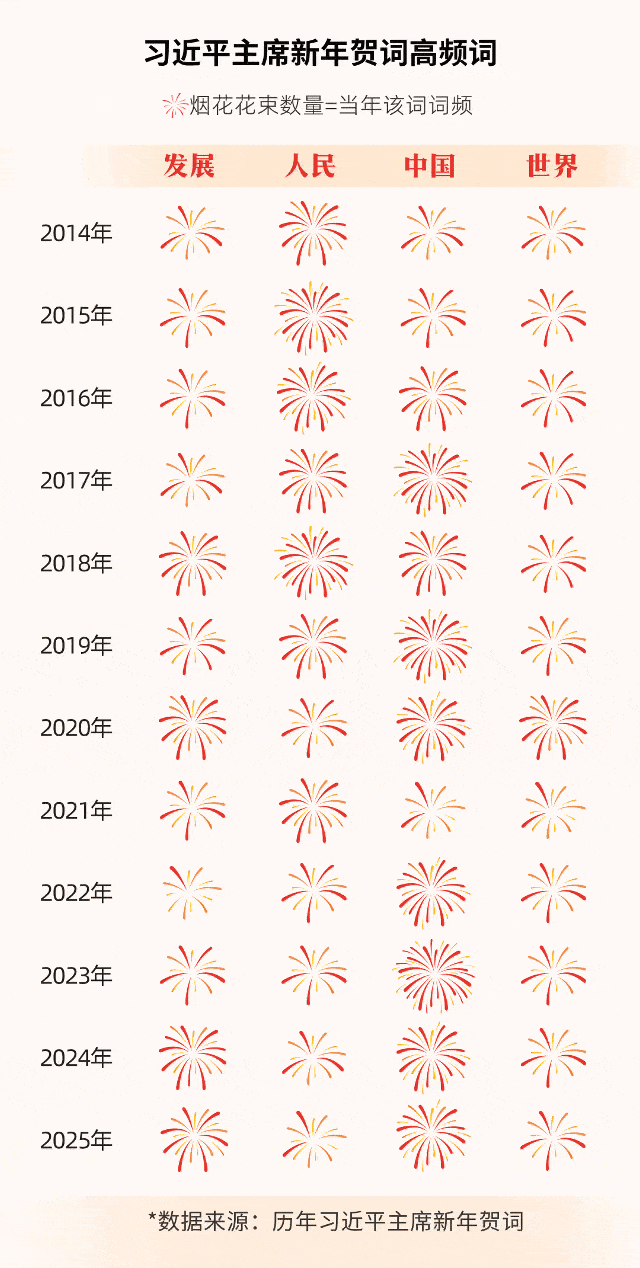 從高頻詞分析結果來看,“發展”“人民”“中國”“世界”是他每年新年賀詞都會強調的詞語。