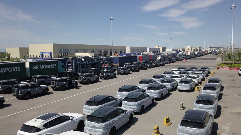 7月11日,在新疆霍爾果斯公路口岸,出口車輛排隊等待查驗出關(無人機照片)。作為全國最大的汽車出口陸路口岸——霍爾果斯口岸今年汽車整車出口數量迅猛增長。