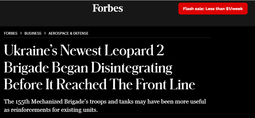 俄烏衝突爆發以來,配備西方援助先進裝備的所謂“北約旅”是烏軍堅守戰線乃至反攻的絕對主力。然而決定部隊戰鬥力的總歸是“人”而不是“武器”,近日烏克蘭媒體爆料稱,在法國接受全套培訓、用法制“凱撒”自行榴彈炮和德制豹2A4主戰坦克武裝起來的烏軍第155機械化旅,竟然在戰場上幾近崩潰。美國“福布斯”網站稱,烏克蘭高層對“北約旅”的政治化考量,是造成這種困境的根源。