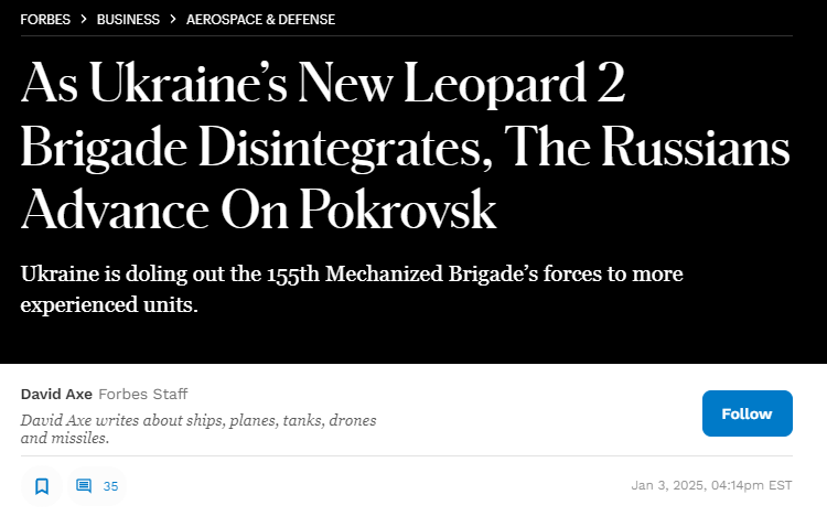 這些因素的綜合作用結果,就是第155機械化旅在戰場上的表現堪稱“災難性”——“福布斯”網站稱,第 155 機械化旅於去年12月被派往激戰中的波克羅夫斯克(俄方稱為紅軍城)。但由於該旅多名指揮官被解除職務,新到的軍官完全不熟悉情況,這種管理上的混亂再加上基層士兵的廣泛逃兵,“第 155 機械化旅還沒有抵達前線實際就解體了”,部分裝備被附近的烏軍第59摩托化旅接收。