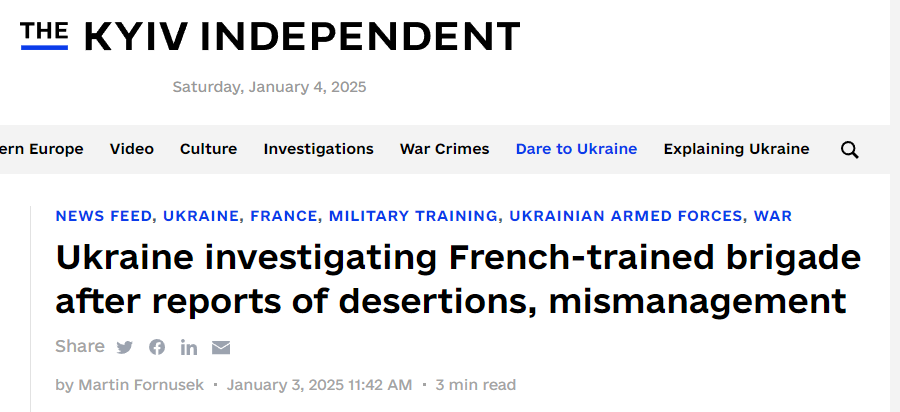 烏克蘭《基輔獨立報》3日稱,烏克蘭國家調查局於2日證實,已對在法國訓練的第155機械化旅涉嫌逃兵和濫用職權的情況展開調查。此前烏克蘭媒體援引烏軍知情人士的爆料稱,根據烏克蘭與法國在2024年6月達成的協議,第155機械化旅於當年9月在法國接受培訓,並換裝全套西式裝備,包括法制AMX-10輕型坦克、“凱撒”自行榴彈炮和德制“豹2A4”主戰坦克。
