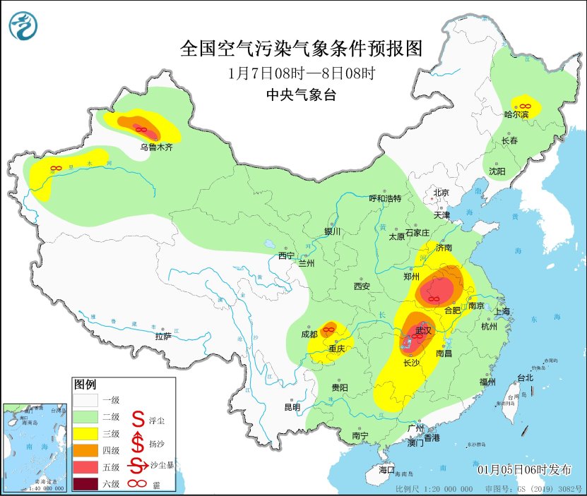 5日至7日,區域大部大氣擴散條件較差,其中湖北中東部、湖南、江西西北部有輕至中度霾,局地重度霾。7日起,上述地區的霾天氣將逐漸減弱或消散。5日早晨至上午,湖北中東部、湖南西北部等地的部分地區有大霧天氣,局地有能見度不足200米的強濃霧。