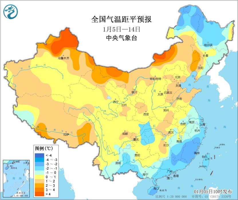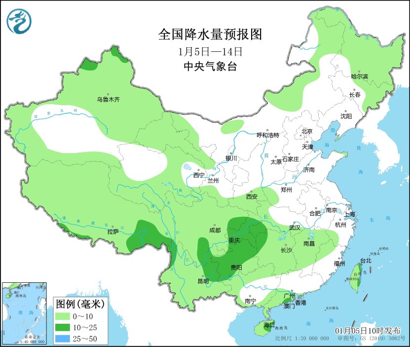 未來10天(1月5-14日),中東部大部降水偏少,新疆北部、東北部分地區和西南地區東部等地累計降水量2~8毫米,雲南西北部、四川南部、重慶、貴州中西部、海南島東部及台灣島東部等地局地累計降水量有15~25毫米。