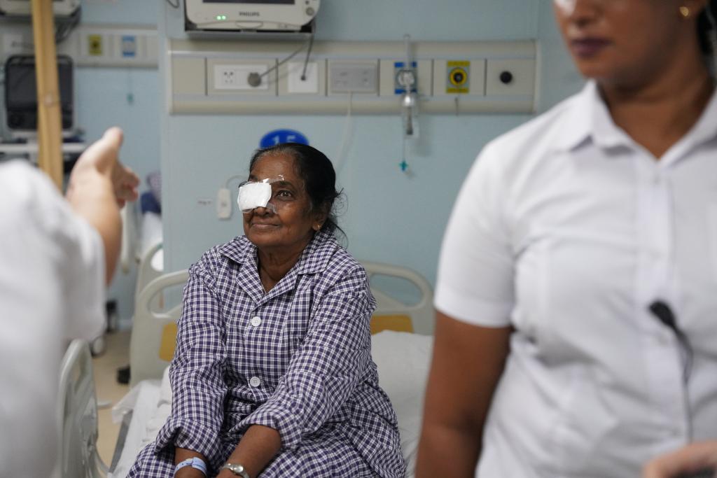 這是2024年12月24日在斯里蘭卡科倫坡港停靠的中國海軍“和平方舟”號醫院船上拍攝的剛進行完白內障手術的本地患者。(新華社記者伍嶽攝)