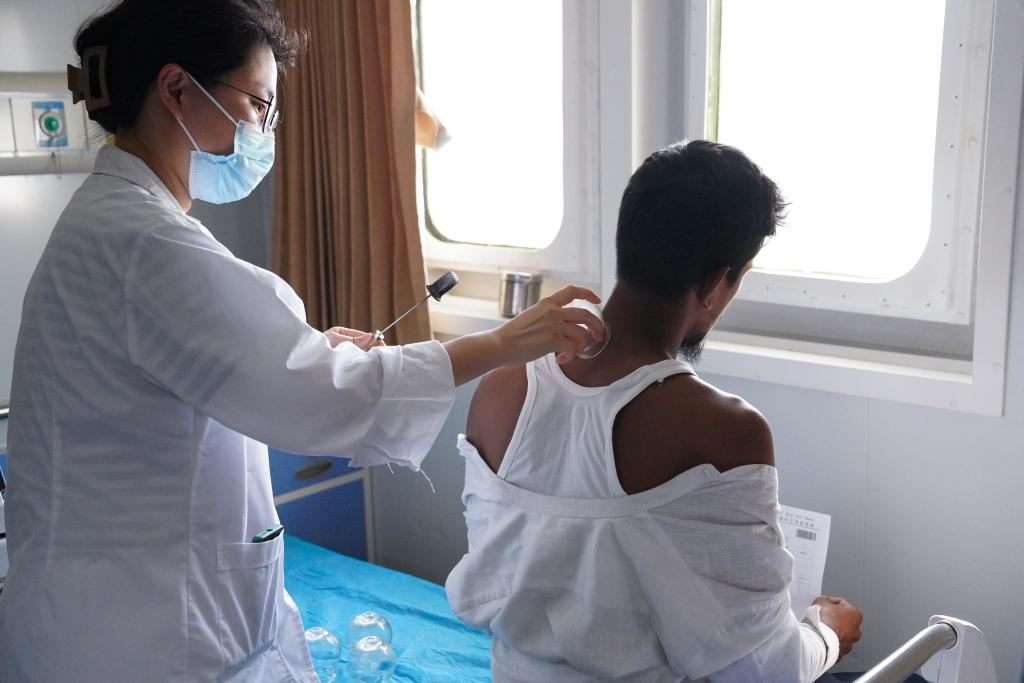 2024年12月24日,在斯里蘭卡科倫坡港,中國海軍“和平方舟”號醫院船上的醫生為19歲的小夥穆賈希德拔火罐。(新華社記者伍嶽攝)