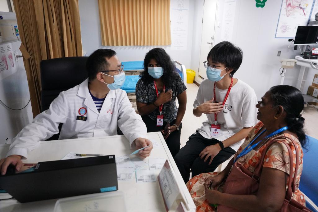 2024年12月24日,在斯里蘭卡科倫坡港,中國海軍“和平方舟”號醫院船上的醫生在志願者的幫助下對當地患者進行問診。(新華社記者伍嶽攝)