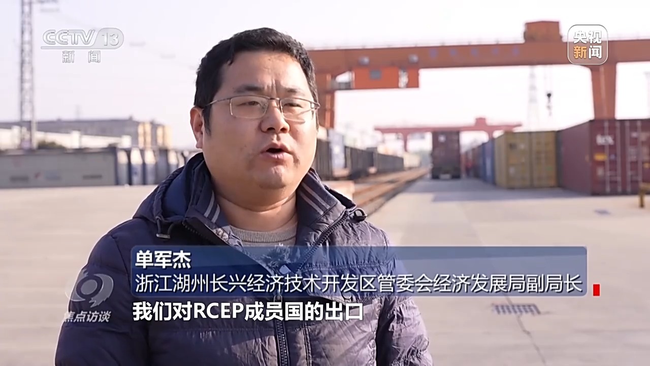 *浙江湖州長興經濟技術開發區管委會經濟發展局副局長 單軍傑:*在RCEP政策紅利下,我們對RCEP成員國的出口呈現出遞增趨勢,2024年1月到10月,長興對RCEP成員國出口額同比上漲15.3%。目前我們周邊也輻射了安吉、廣德、宜興、常州等長三角一些地區,目前長興“鐵公水”多式聯運中心已成為長三角重要的物流集散中心。