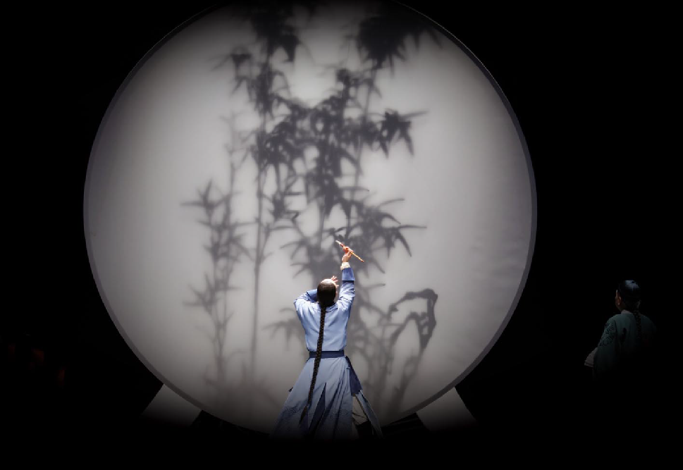 舞台上,古琴與琵琶的悠揚旋律仿若一陣清風,輕輕拂開歷史的畫卷,清代揚州的風情萬種如詩如畫般徐徐展開。鄭板橋筆下的竹、蘭、石化作他性格的三種特質,生動地展現了為官之德、書生之質、為民之心,以及他對生命價值的執着堅守,深深地震撼着每一位觀者的心靈,讓他們沉浸其中,心潮澎湃。