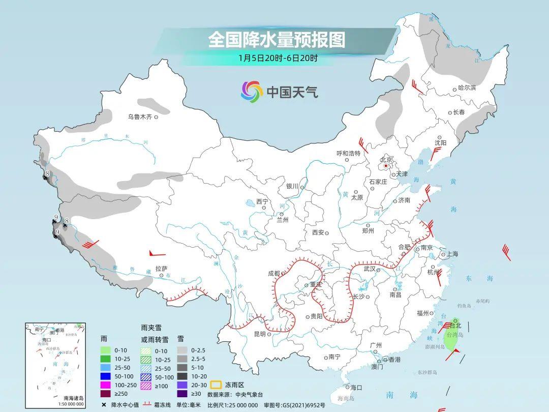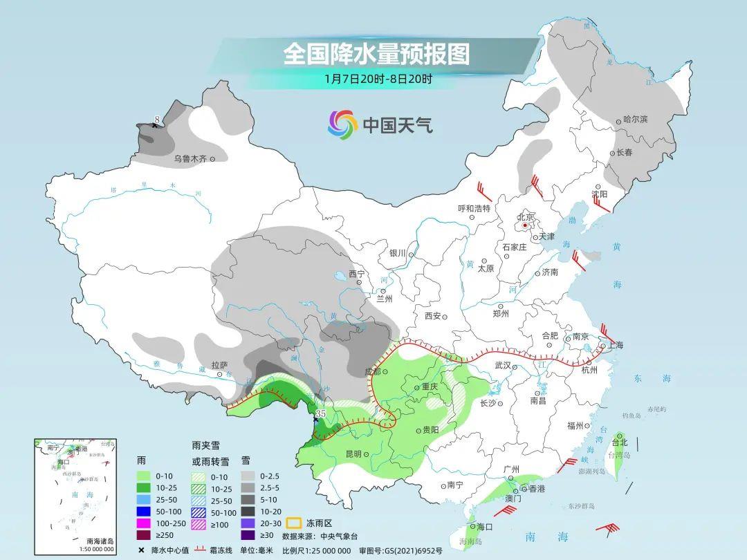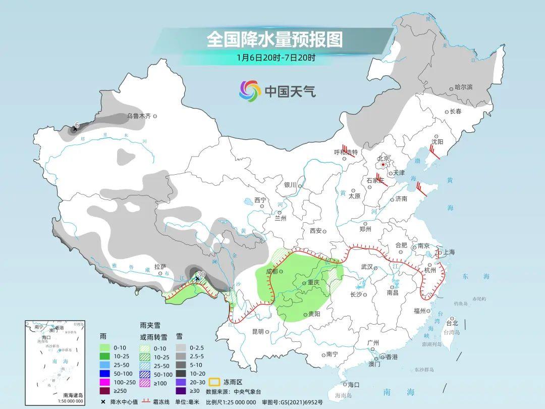 中央氣象台預計,6日夜間至9日,四川南部、雲南北部、貴州中北部、重慶東部、湖北西部和湖南西部有小雨轉雨夾雪或雪,其中四川南部、雲南西北部和東北部、貴州北部、湖北西南部、湖南西北部等地的部分地區有中到大雪,局地暴雪,貴州中北部、湖北西南部、湖南西部等地局地有凍雨。雨雪相態較為複雜,最強雨雪時段將出現在8日。
