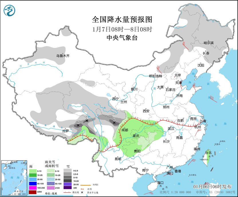 8日,四川南部、雲南西北部和東北部、貴州中北部、重慶東南部、湖北西南部、湖南西北部等地的部分地區有中到大雪,局地暴雪,貴州中北部、四川南部、湖南西部等局地有凍雨。