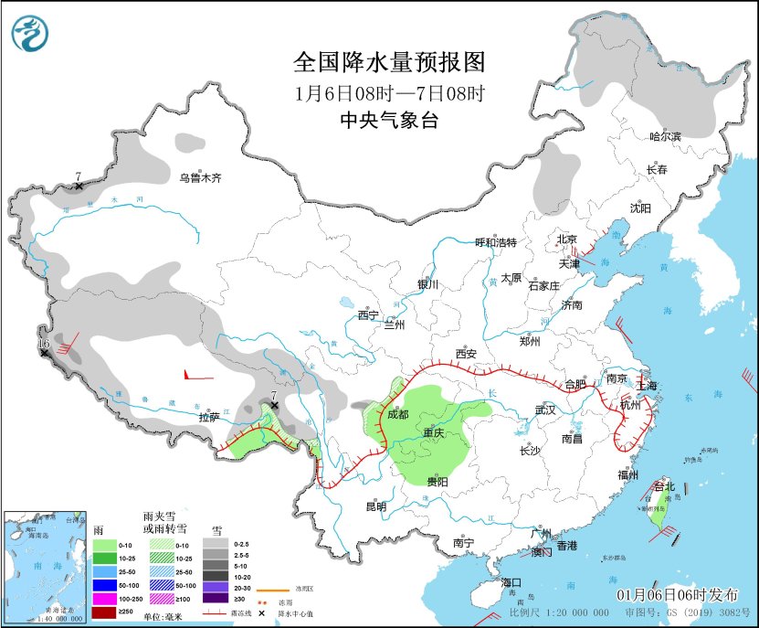 中央氣象台最新預報,受冷空氣影響,預計1月6日夜間至9日,我國大部地區將陸續出現降温,局地降温幅度超過8℃,北方部分地區還將伴有大風天氣,青藏高原東部、西南地區和江南西部等地有一次雨雪天氣過程。其中,四川、雲南、貴州、重慶、湖北、湖南的部分地區有望見到降雪,局地有凍雨,主要雨雪時段在8日。