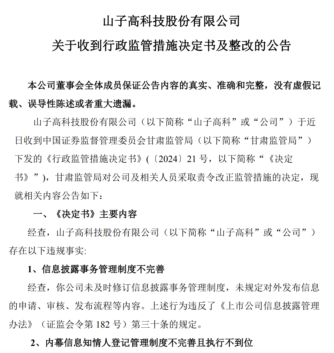 【環球網財經綜合報道】1月6日,據山子高科1月5日晚發佈的公告,該公司於近日收到中國證券監督管理委員會甘肅監管局(以下簡稱“甘肅監管局”)下發的《行政監管措施決定書》(〔2024〕21 號,以下簡稱“《決定書》”),甘肅監管局對山子高科及相關人員採取責令改正監管措施的決定。