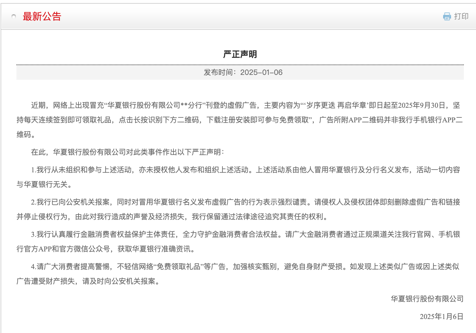 華夏銀行發表聲明,涉及虛假廣告“免費領取禮品”