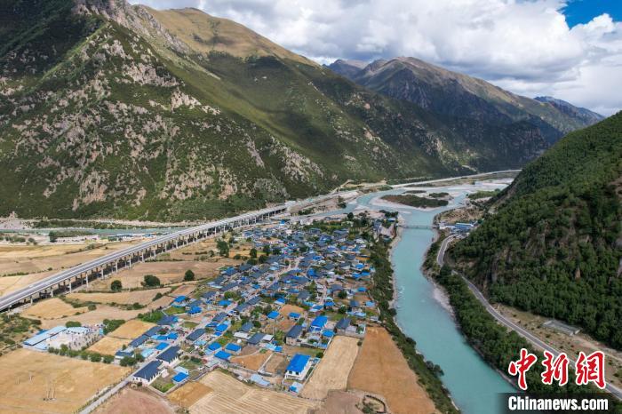 2024年9月1日拍攝的西藏林芝工布江達縣高等級公路(左)和國道318線(右)。(無人機畫面)中新社記者 江飛波 攝