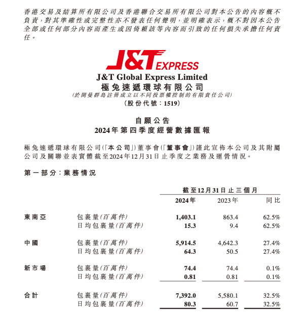 【環球網科技綜合報道】1月7日消息,極兔速遞發佈2024年度業績公告,數據顯示其在過去一年中取得了顯著的成績。2024年第四季度,極兔速遞的包裹量合計達到73.92億件,與去年同期相比增長了32.5%;日均包裹量也達到了8030萬件,同樣實現了32.5%的同比增長。