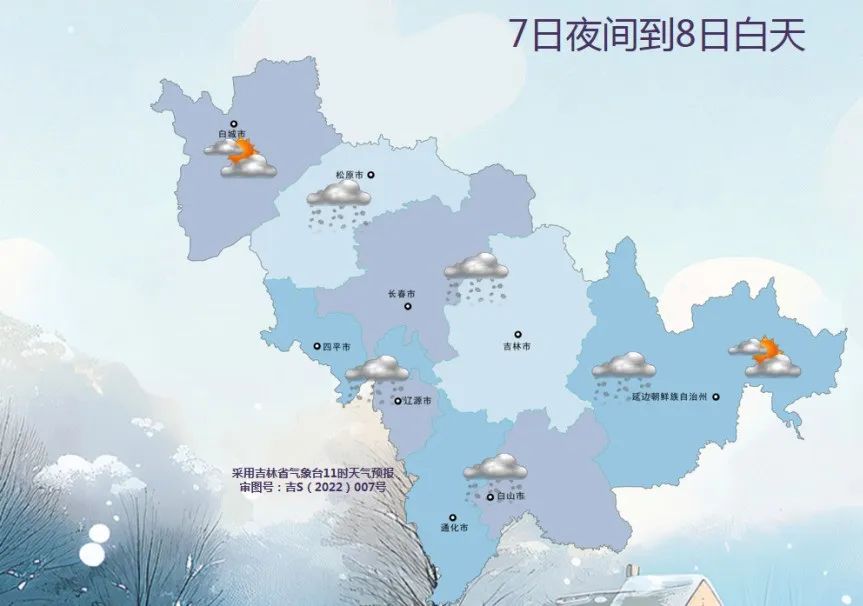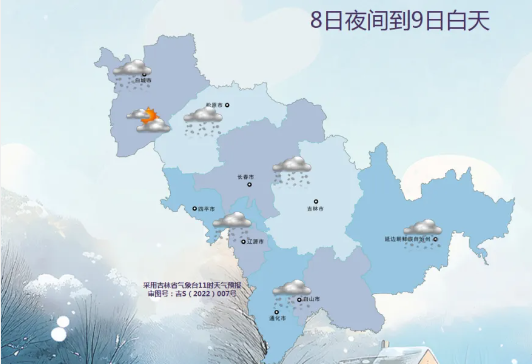 *今天夜間到明天白天,*全省多雲,松原、長春、四平、遼源、吉林、通化、白山、延邊西部、長白山保護開發區有小雪。