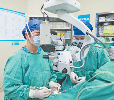 湖南省湘潭市中心醫院眼科主任謝梅芬(左)在進行人工晶體植入手術。